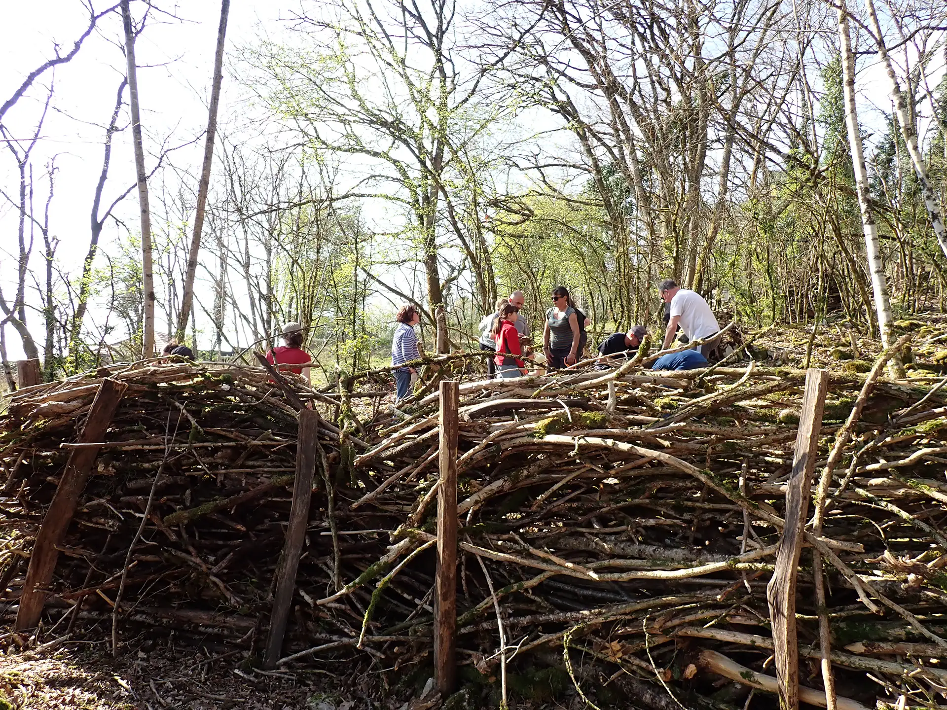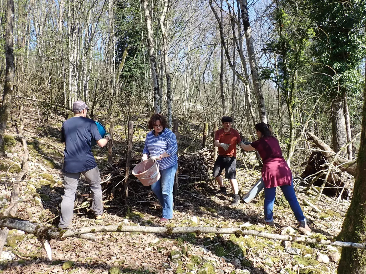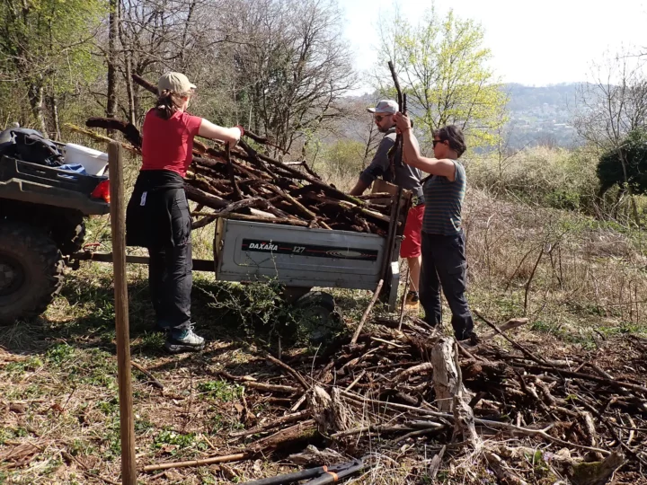 De nombreux morceaux de bois mort (branches, souches, etc.) ont également été sortis de la pâture afin de constituer des haies sèches dans le sous-bois voisin, où elles se décomposeront lentement tout en fournissant un abri à la petite faune.