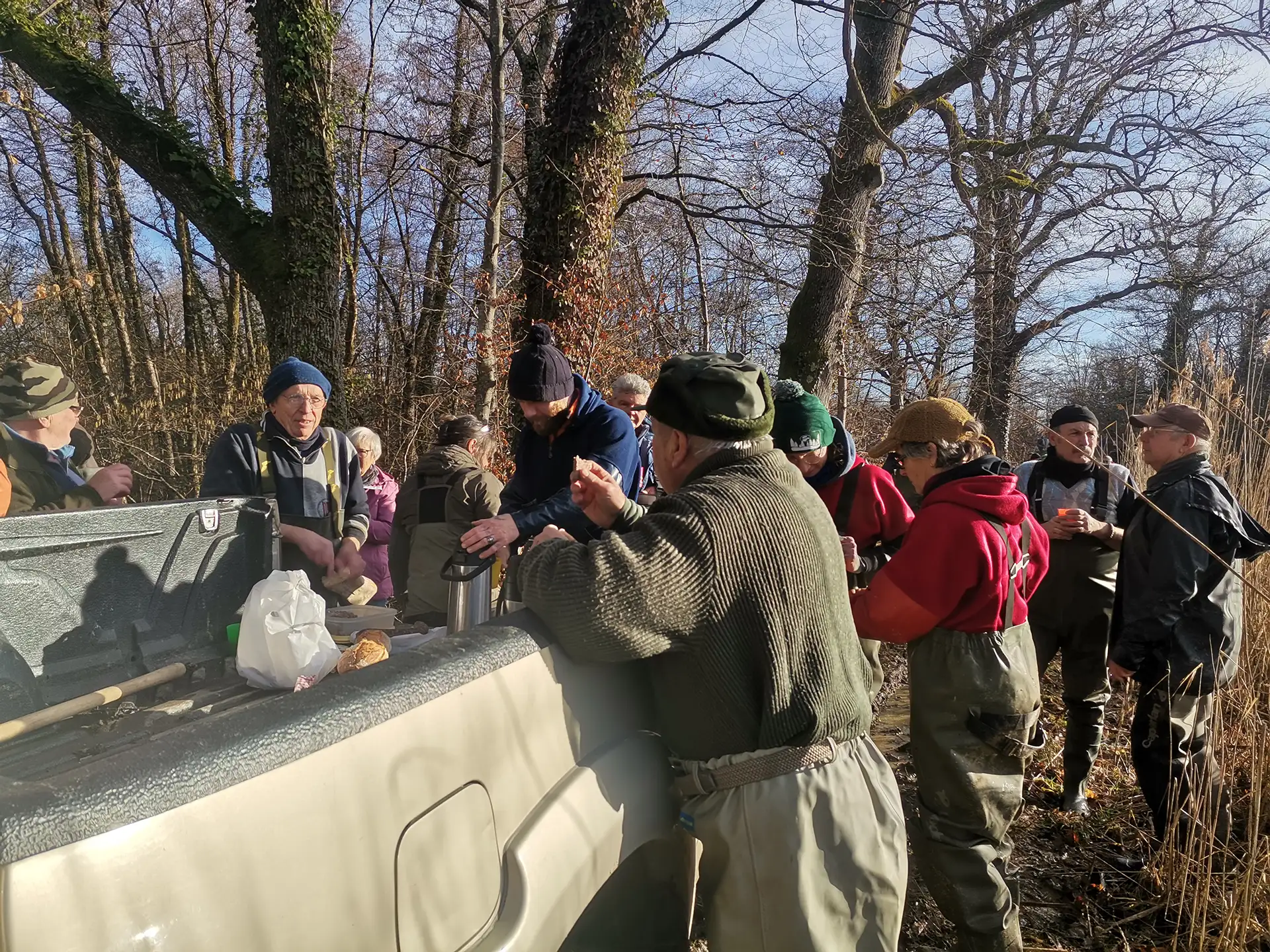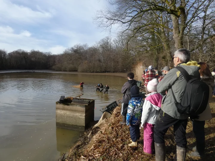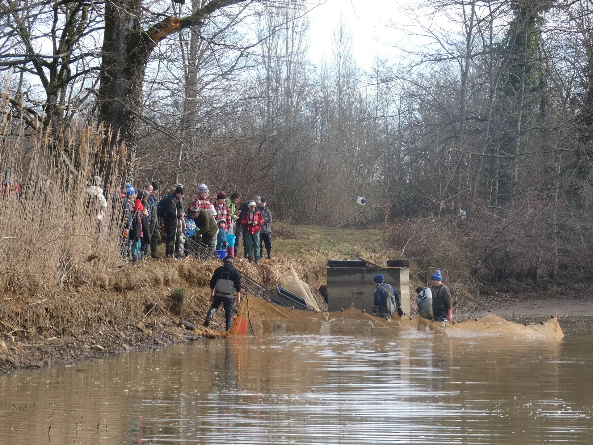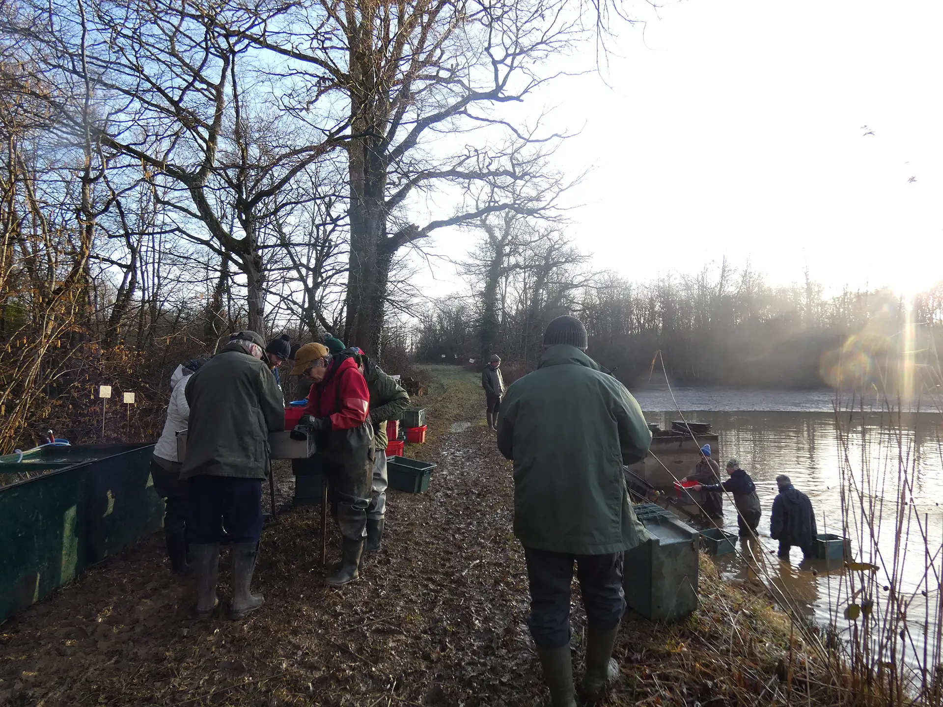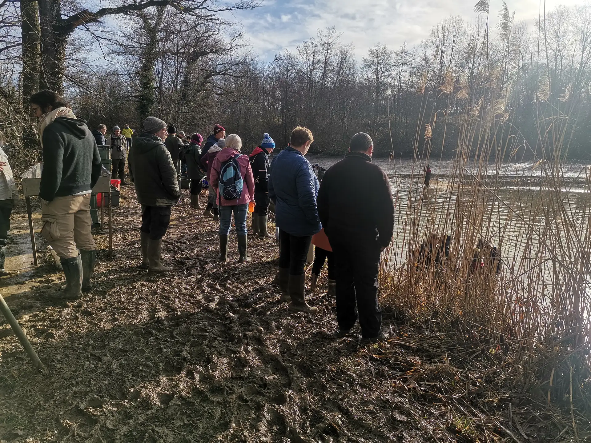 Près de quarante participants – adhérents de l’association et habitants de la commune – sont venus assister à une pêche traditionnelle bressane réalisée par la Pisciculture des marais à l’étang au Curé, site préservé par le Conservatoire depuis plus de 20 ans.