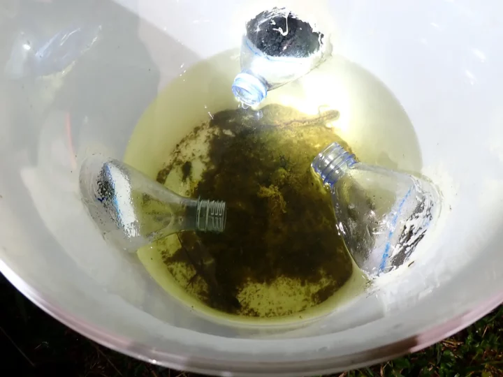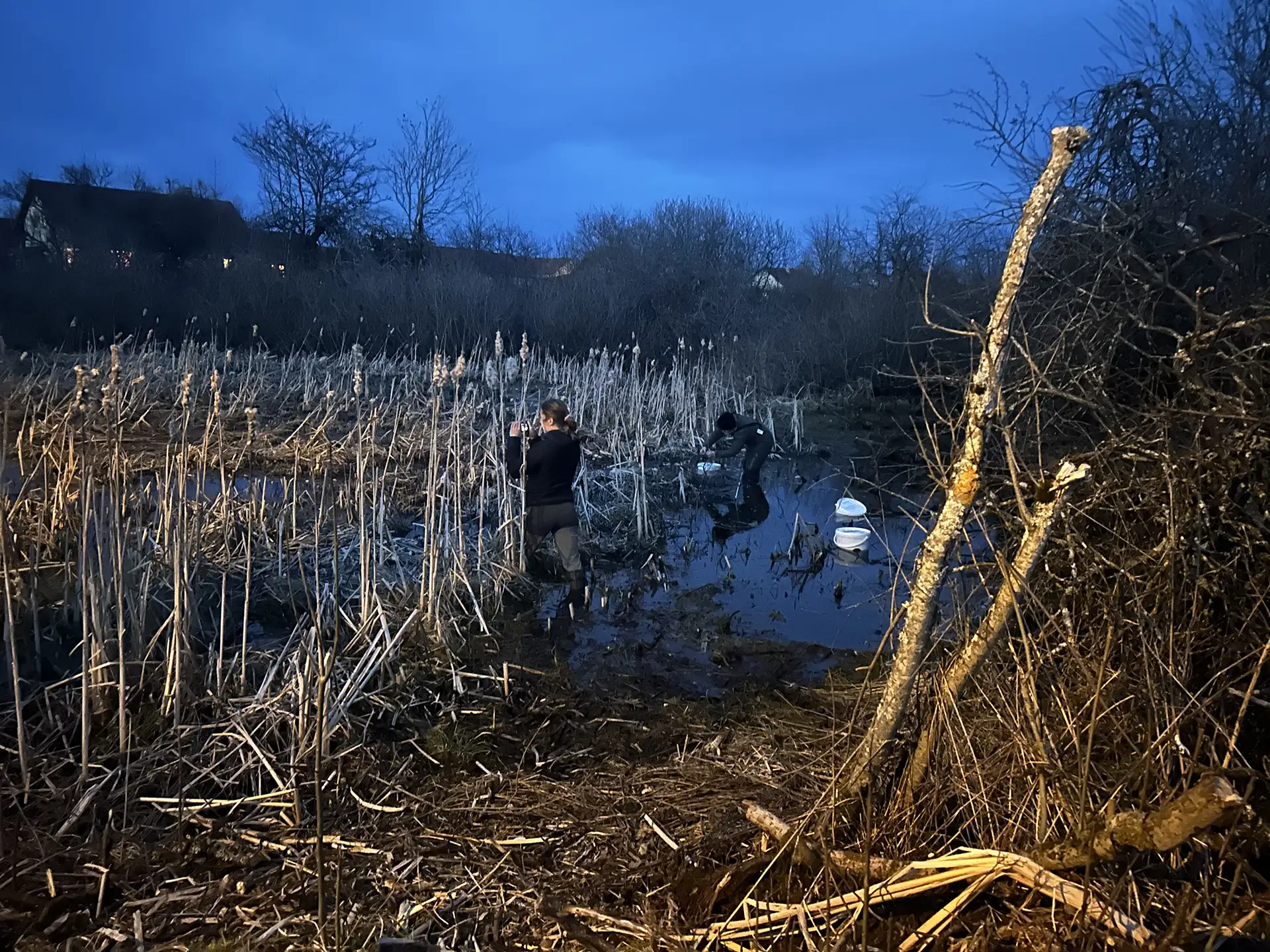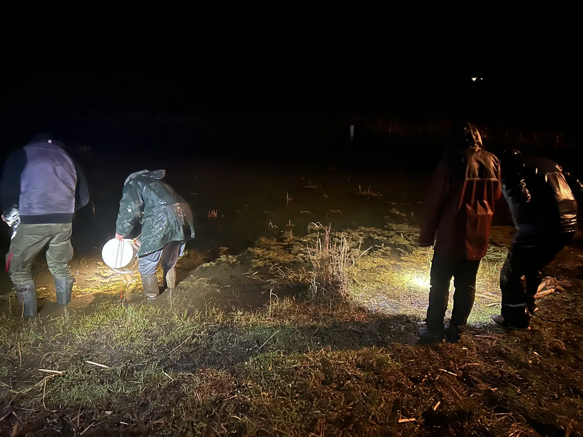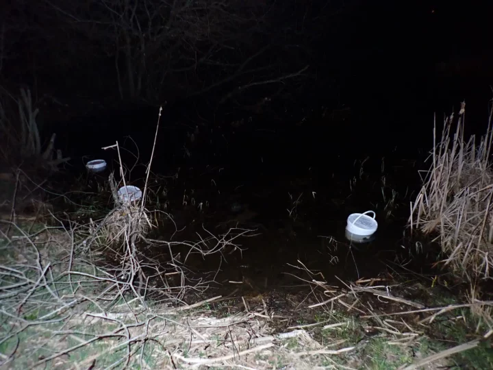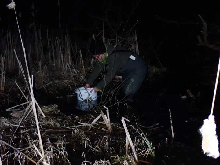 Équipés de lampes, les bénévoles ont pu, une fois la nuit bien tombée, tenter d’écouter les chants d’amphibiens et les observer dans des « amphicapts » (petits seaux de comptage).
